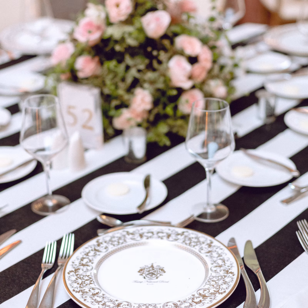 Pink Velluto Lines, White Napkins, Gold Chargers